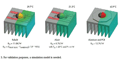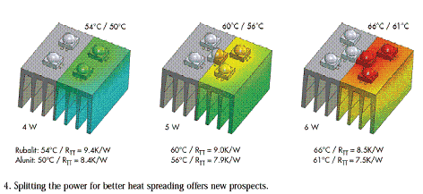 將熱點(diǎn)的溫度降低6k意味著可顯著減少LED的壓力。相同形狀Rubalit組件的總熱阻至少比鋁要好13%。使用Alunit可將CeramCool性能提升最少31%。如果考慮28K的熱降,則Rubalit和Alunit這兩種陶瓷材料帶來(lái)的實(shí)在的好處更要顯著得多。