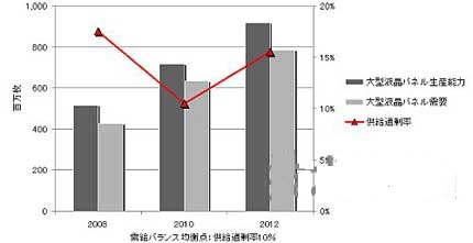 液晶面板的供求關(guān)系在2009年春季至2010年中期的1年多時(shí)間里,一直處于“供不應(yīng)求”及“供需平衡”狀態(tài)。但DisplaySearch預(yù)計(jì),到2012年中國(guó)本土及外資企業(yè)的大量生產(chǎn)線“開(kāi)始量產(chǎn)”時(shí),整個(gè)FPD產(chǎn)業(yè)將“陷入供給過(guò)剩局面”。