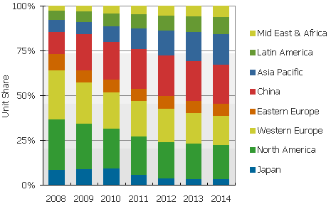 圖一 2008年到2014年中國液晶電視在不同區(qū)域的發(fā)展?fàn)顩r