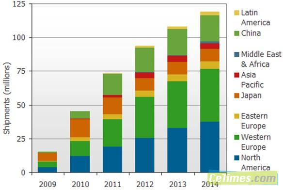 圖一:2009年~2014年聯(lián)網(wǎng)電視在不同區(qū)域的預(yù)估
