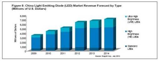 另外,憑借政府的支持和LED日益進(jìn)入液晶電視及普通照明等新的應(yīng)用領(lǐng)域,iSuppli公司預(yù)測(cè),2014年中國(guó)LED營(yíng)業(yè)收入將達(dá)到71億美元,而2009年是34億美元,其間的復(fù)合年度增長(zhǎng)率為12.8%。超高亮度(UHB)LED的增長(zhǎng)速度更快,到2014年銷售額將從2010年的6.86億美元上升到18億美元,復(fù)合年度增長(zhǎng)率為26.9%。