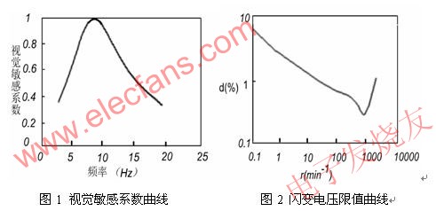 可以被人眼感知的光源閃爍,可以通過統(tǒng)計(jì)的方法來測得人眼的對(duì)光源閃爍的感覺特性。圖1是人眼對(duì)不同頻率的電壓波動(dòng)引起的視覺敏感系數(shù)曲線。從曲線上可以看出最敏感的頻率是8.8Hz,偏離該頻率后,敏感度隨頻率而降低。當(dāng)閃爍頻率40Hz以上時(shí),感覺就不靈敏;50Hz以上的閃爍就完全沒有感覺。