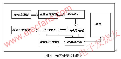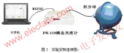 為了精確測量光通量,把光源放在積分球中。經(jīng)過V(λ)校準(zhǔn)的光電探測器接受光信號(hào),其輸出的電信號(hào)經(jīng)過放大轉(zhuǎn)換電路,將光電探測器輸出的光電流信號(hào)轉(zhuǎn)換成較大的電壓信號(hào),利用AD轉(zhuǎn)換器進(jìn)行采樣。由于單片機(jī)讀取和存儲(chǔ)數(shù)據(jù)速度較慢,故而采用了雙口RAM和地址發(fā)生電路,使得光度計(jì)能夠在采用時(shí)自動(dòng)對(duì)數(shù)據(jù)進(jìn)行存儲(chǔ)。單片機(jī)則在所有采樣過程執(zhí)行完畢后,再從雙口RAM內(nèi)讀取數(shù)據(jù),并發(fā)送給微機(jī)顯示處理。系統(tǒng)結(jié)構(gòu)圖和實(shí)物連接圖如下。