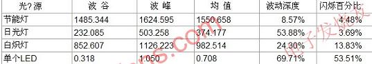 在實(shí)驗(yàn)中,我們利用瞬態(tài)光度計(jì)對(duì)26W螺旋型電子節(jié)能燈,60W普通直管型日光燈,60W普通白熾燈,單個(gè)紅色LED等四種典型的照明光源測量其光通量的變化波形,計(jì)算波動(dòng)深度。在PR110中,我們?cè)O(shè)定采樣間隔為0.1ms,所有燈都采用50Hz交流電供電,測量結(jié)果如表1。
