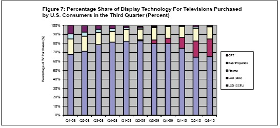 第三季度,大多數(shù)美國消費者繼續(xù)購買老式的非LED型液晶電視,即CCFL電視。第三季度CCFL液晶電視占總體美國電視市場的份額從第二季度的64.6%升到65.3%,等離子、背投和CRT等其它顯示技術(shù)所占份額相應(yīng)下降。