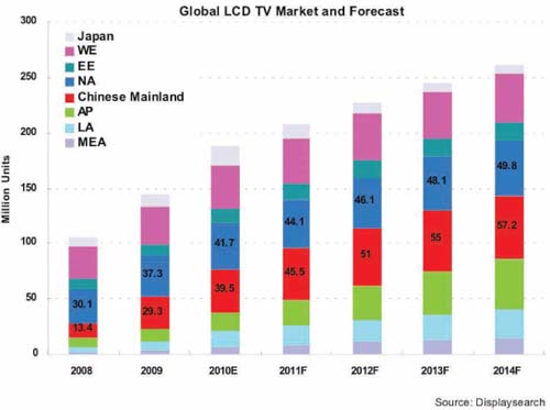 2010年全球MOCVD新增安裝量中,由于受到LED背光在LCD TV滲透的加快帶動下, LCD TV制造強(qiáng)國的韓國增量最多,其次是臺灣地區(qū)。根據(jù)SEMI統(tǒng)計,中國大陸今年MOCVD新增量大概在177臺,出貨量居全球第三。另外,根據(jù)SEMI統(tǒng)計和分析,結(jié)合MOCVD供應(yīng)情況,2011年中國MOCVD新增量份額有望達(dá)到全球的40%,而其它地區(qū)的增量會保持與2010年相當(dāng)?shù)乃交蛳陆怠?
