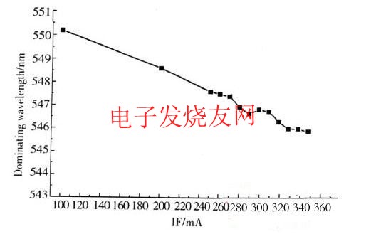 隨著電流增加,器件出光的主波長(zhǎng)在減小,這是因?yàn)殡娏髟黾?,色坐?biāo)減小,標(biāo)準(zhǔn)白光點(diǎn)和色坐標(biāo)點(diǎn)的連線的延長(zhǎng)線與380~760nm的光譜軌跡相交點(diǎn)對(duì)應(yīng)的波長(zhǎng)值變小。