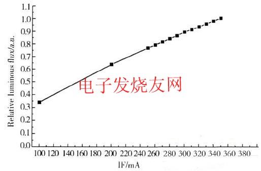 發(fā)光二極管在調(diào)節(jié)光通量方面具有一定的優(yōu)勢(shì),器件的光通量隨著電流增加而增加,在100mA~250mA,光通量增加率為126.2%;從250mA~350mA時(shí),電流的增加輻度較小且呈非線性增加,增加率為30.4%。PN結(jié)是發(fā)光二極管的核心部分,電流增加后,注入到發(fā)光區(qū)的電子和空穴數(shù)量增加,發(fā)生輻射復(fù)合的數(shù)量也會(huì)增加,器件的光通量增加。但當(dāng)注入電流繼續(xù)增加到某一值時(shí),光通量輸出不再增加,趨于飽和。
