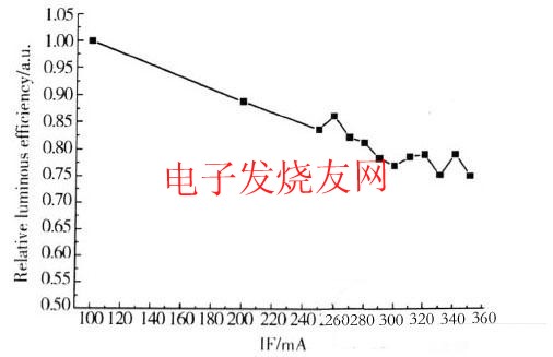 現(xiàn)在LED的發(fā)光顏色越來越豐富,LED的色坐標(biāo)參數(shù)是LED重要的物理參數(shù)之一,隨著注入電流的增加,器件出光的色坐標(biāo)在一定程度上減小,如圖1所示。