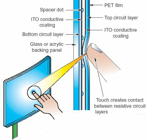 電阻式:從目前的推廣應(yīng)用來看,電阻式觸摸屏是占主導(dǎo)地位的觸摸技術(shù)。它由玻璃面板,銥錫氧化物(ITO)電阻涂層組成,并帶有導(dǎo)電涂層的護板,沿著邊緣有銀色的總線條。兩個層之間用絕緣小點隔開。觸摸屏幕時,護板彎曲與玻璃上的涂膜相接觸(圖1)。