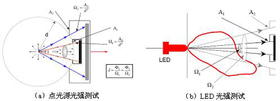 圖4中,點(diǎn)光源光強(qiáng)在空間各方向均勻分布,在不同距離處用不同接收孔徑的探測(cè)器接收得到的測(cè)試結(jié)果不會(huì)改變。但是,LED由于其光強(qiáng)分布不一致,使得測(cè)試結(jié)果隨測(cè)試距離和探測(cè)器孔徑而變化。因此,CIE-127提出了兩種推薦測(cè)試條件,使得各個(gè)LED在同一條件下進(jìn)行光強(qiáng)測(cè)試與評(píng)價(jià)如圖5所示。目前,CIE-127推薦測(cè)試條件已經(jīng)被各LED制造商和檢測(cè)機(jī)構(gòu)引用。