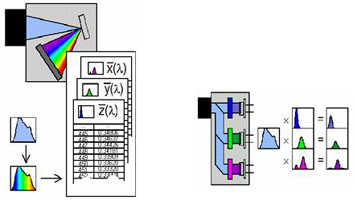 現(xiàn)有的顏色特性測(cè)試方法有分光光度法和積分法。分光光度法是通過單色儀分光測(cè)得LED光譜功率分布,然后利用色度加權(quán)函數(shù)積分獲得對(duì)應(yīng)色度參數(shù);積分法是利用特定濾色片配合光電探測(cè)器直接測(cè)得色度參數(shù)(見圖7)。分光光度法的準(zhǔn)確性要大大高于積分法。