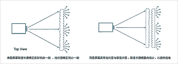 (UCS/RUCS屏幕)在兩層透鏡之間的光學(xué)鏡頭表面覆蓋了一層黑色素層,可吸收環(huán)境光,柱狀的鏡頭能拾取投影機(jī)的光線,并傳送到觀視者,而前面的環(huán)境光則會被吸收。