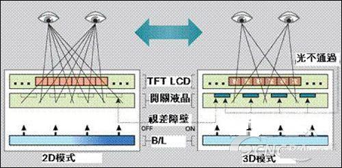 這些條紋寬幾十微米,通過(guò)它們的光就形成了垂直的細(xì)條柵模式,稱之為“視差障壁”。而該技術(shù)正是利用了安置在背光模塊及LCD面板間的視差障壁,在立體顯示模式下,應(yīng)該由左眼看到的圖像顯示在液晶屏上時(shí),不透明的條紋會(huì)遮擋右眼;同理,應(yīng)該由右眼看到的圖像顯示在液晶屏上時(shí),不透明的條紋會(huì)遮擋左眼,通過(guò)將左眼和右眼的可視畫面分開(kāi),使觀者看到3D影像。