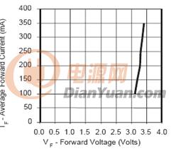 假如用干電池或蓄電池供電,那么因?yàn)長(zhǎng)ED伏安特性的非線性,很小的電壓變化就會(huì)引起很大的電流變化,上圖中電源電壓在3.3V時(shí)正向電流為20mA的LED,如果用3節(jié)干電池供電,新的電池電壓超過1.5V,3節(jié)就是4.5V,LED的電流就會(huì)超過100mA,很快就會(huì)燒壞。對(duì)于1W的大功率LED也是如此,圖2是某公司1W的LED伏安特性,而一個(gè)12V蓄電池的電壓,在充滿電到快放完電的電壓可以從14.5V降到10.5V。相差將近20%。從伏安特性上可以看出,電源電壓的10%的變化(3.4V-3.1V),就會(huì)引起正向電流的3.5倍的變化(從350mA變到100mA)。