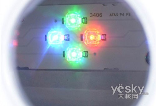 索尼70X300A上使用的RGB-LED背光單元放大圖,每一組由2個(gè)綠光、1個(gè)紅光和1個(gè)藍(lán)光LED元件組成