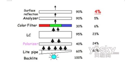 首先,這種方法省去了彩色濾色片,而濾色片是光能的主要吸收者,它會(huì)損失光能70%以上。下圖表明了光能從光源出發(fā)以后所受到的損失。