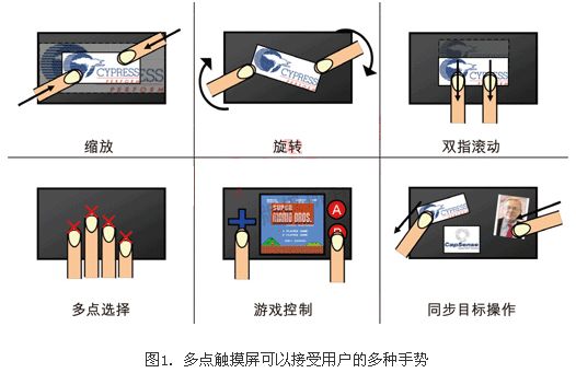 用投射式觸摸屏實(shí)現(xiàn)的幾種常見的多點(diǎn)觸摸手勢包括手指的張合、縮放、雙指的滑動(dòng)和旋轉(zhuǎn)。它們可以快速方便地處理數(shù)據(jù)、內(nèi)容和用戶參數(shù)。便攜游戲和文本/電子郵件應(yīng)用也可以利用多點(diǎn)觸摸技術(shù)。在一個(gè)多指觸摸過程中,多觸點(diǎn)APA(全點(diǎn)可尋址)模式可以精確地測定每個(gè)手指所按壓的坐標(biāo)位置。