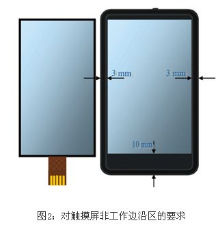 對尺寸小于4英寸(10厘米)的觸摸屏,觸摸屏的邊沿寬度,在觸摸傳感器尾線一側(cè)應(yīng)不窄于10mm,與尾線側(cè)毗鄰的兩側(cè)應(yīng)不窄于3mm。這個(gè)邊沿空間用于隱藏把透明的ITO圖案鏈接到控制電路的非透明銀質(zhì)箔線并隱藏控制電路本身。對于使用玻璃基底的觸摸屏,邊沿的寬度或許可以做得更窄,但仍建議使用上述指導(dǎo)原則。圖2 描述了這些指導(dǎo)原則。