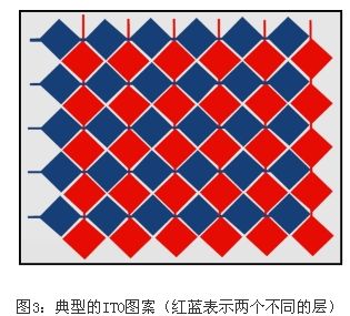 在完成了機(jī)械評估之后,必須為觸摸屏選擇一個(gè)合適的基底。圖3 顯示了投射式電容觸摸屏的一個(gè)典型ITO圖案。