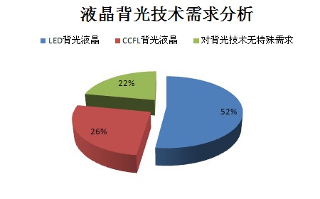 根據(jù)賽迪網(wǎng)對350位網(wǎng)友所作的調(diào)查顯示,在購買顯示器的時(shí)候,考慮LED產(chǎn)品的有182位,占52%。依舊會考慮CCFL產(chǎn)品的有91位,占26%,而表示不關(guān)心背光技術(shù)的有77位,占22%。而在1年多以前類似的調(diào)查當(dāng)中,表示會選購LED產(chǎn)品的用戶比例還不足25%。由此,很多廠商甚至已經(jīng)在產(chǎn)品線上實(shí)現(xiàn)了全部LED化。而隨著LED產(chǎn)品價(jià)格的進(jìn)一步走低,在未來一到兩年之內(nèi),CCFL產(chǎn)品很有可能會被完全取代。
