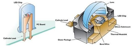 傳統(tǒng)炮彈型封裝,以插件式運(yùn)用,廣泛運(yùn)在家電或是通訊產(chǎn)品的指示燈,??吹降念伾酁榧t、黃、綠色光等,但因?yàn)榇蟛糠諰ED產(chǎn)生的熱只能藉由2根導(dǎo)線,往組裝的基板上導(dǎo)熱,散熱效果不佳。