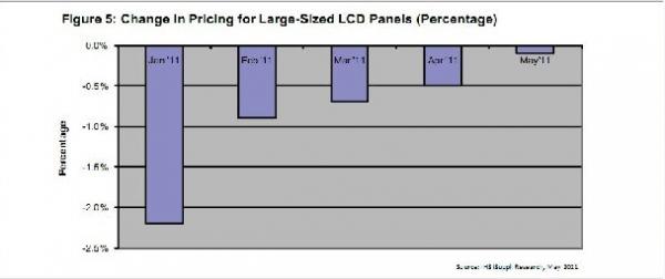 上圖所示為IHS iSuppli公司對(duì)1-5月大尺寸LCD面板價(jià)格變動(dòng)的逐月預(yù)測(cè)。大尺寸LCD面板是指對(duì)角尺寸從10.1到55英寸以上的面板。