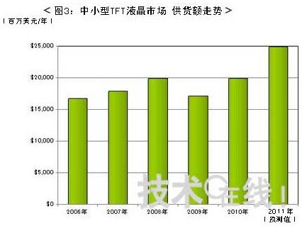 圖3表示中小型液晶市場過去5年內(nèi)的業(yè)績與今年的供貨額預(yù)測。手機(jī)及數(shù)碼相機(jī)等使用的中小型FPD因價(jià)格不斷降低,市場范圍逐步擴(kuò)大,導(dǎo)致中小型液晶 市場的供貨額與供貨量增長幅度相比,持續(xù)出現(xiàn)了低增長,因2008年雷曼危機(jī)后消費(fèi)低迷,這一市場陷入了供貨額大幅減少的局面。在此期間,許多中小型液晶 廠商都有過力圖通過縮小業(yè)務(wù)而生存下去的辛酸經(jīng)歷,包括同行業(yè)廠商間的業(yè)務(wù)撤銷與合并以及淘汰設(shè)備等。
