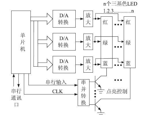 如圖2 中,87LPC762 單片機(jī)傳送數(shù)據(jù)到三路D /A 轉(zhuǎn)換器,將數(shù)字量轉(zhuǎn)換為模擬量,經(jīng)功率放大電路分別控制紅、綠、藍(lán)三色LED 發(fā)光的強(qiáng)度,從而控制LED 發(fā)光的顏色以及亮度, 對(duì)于多個(gè)LED采用動(dòng)態(tài)掃描的方式,由單片機(jī)控制兩個(gè)輸出端子以CLK 為基準(zhǔn)輸出串行信號(hào),經(jīng)串并轉(zhuǎn)換器件控制處于開(kāi)關(guān)工作的三極管分別對(duì)三基色LED 進(jìn)行點(diǎn)亮,完成對(duì)圖形圖案的控制。最后,此系統(tǒng)即可完成調(diào)光所需的各項(xiàng)功能。串行通訊接口采用RS232標(biāo)準(zhǔn)總線與計(jì)算機(jī)連接,可將計(jì)算機(jī)中需要顯示的圖案或文字傳送到本系統(tǒng)并顯示出來(lái)。