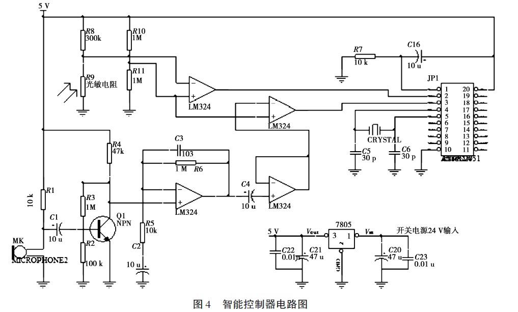 基于AT89C2051的智能控制器電路如圖4所示,其主要由傳感器單元、A/D轉(zhuǎn)換單元、控制器單元組成。AT89C2051芯片用于對(duì)來(lái)自聲控和光控傳感器檢測(cè)到的信號(hào)經(jīng)過(guò)整形以后的信號(hào)數(shù)據(jù)做處理,進(jìn)而控制LED驅(qū)動(dòng)器。該電路中AT89C2051的p3.0和p3.1端口用作輸入信號(hào)檢測(cè),剩下的13個(gè)端口可選擇輸出控制。軟件流程圖如圖5所示。