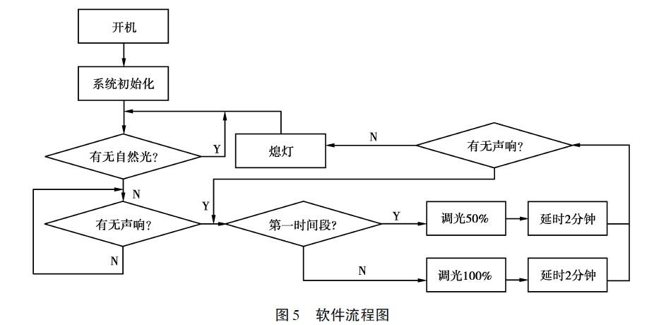 (2)當(dāng)無(wú)光(自然光)時(shí),若有人經(jīng)過(guò)產(chǎn)生聲響,控制器先判斷時(shí)間段,若是在天色完全暗下來(lái)時(shí)(定義為第一時(shí)間段),則使LED發(fā)出100%亮度。其余時(shí)間段即天色還較亮,控制器可輸出50%占空比方波,使LED發(fā)出50%亮度即可,這樣可進(jìn)一步節(jié)省電能,提高用電效率。
