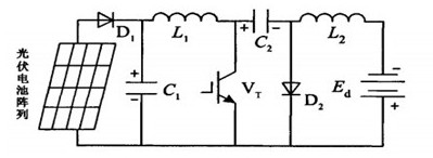 充電控制器作為光伏電池和鉛酸蓄電池的接口電路,一般都希望讓其工作在最大功率點(diǎn),實(shí)現(xiàn)更高的效率,但是在實(shí)現(xiàn)最大功率點(diǎn)跟蹤(MPPT)的同時,還需要考慮進(jìn)行蓄電池充電控制。目前常用的主電路拓?fù)渲饕薪祲盒碗娐罚˙uck)變換器、升壓型電路(Boost)變換器、丘克電路(Cuk)變換器等。一般光伏電池輸出電壓波動較大,而Buck變換器或Boost變換器只能進(jìn)行降壓或升壓變換,受此影響,光伏電池不能在大范圍內(nèi)完全工作于最大功率點(diǎn),從而造成系統(tǒng)效率下降。同時,Buck變換器輸入電流紋波較大,如果輸入端不加一個儲能電容就會使系統(tǒng)工作在斷續(xù)狀態(tài)下,從而導(dǎo)致光伏電池輸出電流時斷時續(xù),不能處于最佳工作狀態(tài);而Boost變換器輸出電流紋波較大,用此電流對蓄電池進(jìn)行充電,不利于蓄電池的使用壽命;Cuk變換器同時具有升壓和降壓功能,將Cuk變換器應(yīng)用于光伏系統(tǒng)充電控制器中,可以在較大范圍內(nèi)實(shí)現(xiàn)最大功率點(diǎn)跟蹤,有利于系統(tǒng)效率的提高。因此,常選用Cuk變換器作為充電控制器的主電路,其系統(tǒng)拓?fù)淙鐖D7所示。