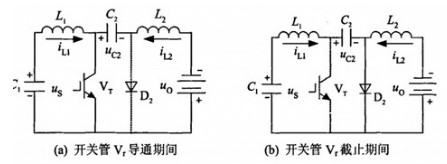 2、開關(guān)管Vr截止期間此期間開關(guān)管Vr截止,二極管D2正偏而導(dǎo)通,電源和Ll的釋能電流iLl向C2充電,同時L2的釋能電流iL2以維持負(fù)載,如圖8(b)所示。因此,Vr截止期間C2充電,Vr導(dǎo)通期間C2向負(fù)載放電,C2起能量傳遞的作用。