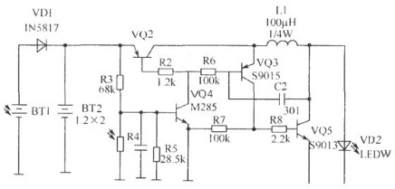 該電路的工作原理:白天有太陽光時,由BT1把光能轉(zhuǎn)換為電能,由VD1對BT2充電,由于有光照,光敏電阻呈低阻,VQ4 b極為低電平而截止。當(dāng)晚上無光照時光敏電阻呈高阻,VQ4導(dǎo)通,VQ2 b極為低電平也導(dǎo)通,由VQ3、VQ5、C2、R6、L1組成的DC升壓電路工作,LED得電發(fā)光。