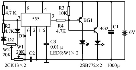 用555 時基電路可組成各種形式的自激式多諧振蕩器。大功率LED 頻閃光源,主要由1 個555 多諧振蕩器構成的信號發(fā)生器、1 個功率放大器和2 個LED 組成。信號發(fā)生器的作用是產(chǎn)生所需要的工作頻率脈沖,并且振蕩頻率可以根據(jù)需要調(diào)整。功率放大器將脈沖信號放大后,驅動大功率LED 發(fā)光。改變信號發(fā)生器的振蕩頻率,可使光源的頻閃時間間隔隨之變化;過增、減LED 個數(shù)或更換不同功率的LED ,可以改變光源的總亮度。如圖3 所示,電路中的555 多諧振蕩器電路,既可以調(diào)節(jié)振蕩頻率,又可以調(diào)整振蕩脈沖的占空比。信號發(fā)生器的振蕩頻率就是LED 閃光的頻率,可以根據(jù)拍攝對象調(diào)整。而振蕩脈沖的占空比,決定了LED 每次頻閃的延續(xù)時間。