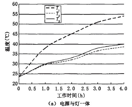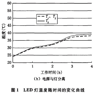 由于電源本身產(chǎn)生一定的熱量,使得LED燈上的熱量來(lái)源增加。同時(shí),電源與燈一體設(shè)計(jì)使得LED燈整體受熱不均,這些因素都會(huì)導(dǎo)致燈具發(fā)生疲勞和早期失效,而影響其壽命。圖1為L(zhǎng)ED燈溫度隨工作時(shí)間的變化曲線,圖中T1為放置電源處溫度,T2為遠(yuǎn)離電源處溫度,T3為燈體中心溫度。從圖中看出,隨著工作時(shí)間的增加,圖1(a)中T1遠(yuǎn)大于T2和T3;圖1(b)中T1與T2兩曲線重合,T3略大于T1和T2??梢?jiàn)分離電源后,整燈的溫度分布很均勻。