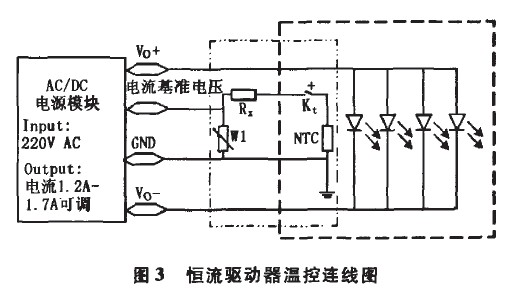 圖3為恒流電源給LED燈供電控制原理圖。電源的指標(biāo)為:220V AC輸入,電流1.2一1.7A可調(diào),電壓自適應(yīng)(36~39V)。圖3中左側(cè)細(xì)虛線框中部分為控制電路,其中W1為可調(diào)電阻器;NTC為負(fù)溫度系數(shù)熱敏電阻;Kt為常開(kāi)溫度繼電器,其閉合溫度為56℃,自動(dòng)斷開(kāi)溫度為45℃;Rx為匹配電阻。圖3右側(cè)粗虛線框中部分為L(zhǎng)ED模塊部分。溫度繼電器和熱敏電阻安裝在LED模塊上,并與模塊緊密接觸,以便將LED的溫度信息反饋給控制電路。常溫下Kt