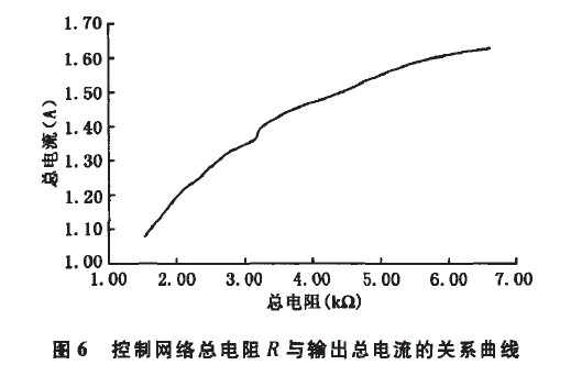 控制電路阻值與輸出總電流的關(guān)系列于表1,其中R為控制電路的等效電阻。經(jīng)過(guò)在恒溫箱中測(cè)試,每2℃記錄1組數(shù)據(jù)得到如圖5所示的NTC熱敏電阻的溫度一阻值曲線。該方案中,驅(qū)動(dòng)電源通過(guò)接收到反饋的溫度信息來(lái)控制輸出電流,根據(jù)圖5中NTC的溫度與阻值的關(guān)系,只要找到輸出電流隨總阻值的變化關(guān)系(如圖6所示),再進(jìn)行適當(dāng)?shù)碾娮杵ヅ?,便可找到溫度與驅(qū)動(dòng)器輸出電流的關(guān)系。