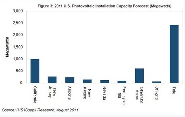 據(jù)IHS iSuppli公司的光伏市場研究報告,2011年美國光伏(PV)安裝容量將大增166%,總體安裝容量將達(dá)到2.4GW,加州將一馬當(dāng)先。