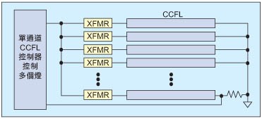 CCFL已在筆記型電腦、數(shù)位相機、導(dǎo)航系統(tǒng)以及其他具有較小LCD螢?zāi)坏脑O(shè)備中使用多年。這些類型的設(shè)備通常只用一個CCFL,因此,傳統(tǒng)設(shè)計只用一個CCFL控制器。隨著大尺寸LCD面板的出現(xiàn),帶來對多CCFL的需求,有必要采用新的方式來應(yīng)對這種新的需求??赡艿姆绞街皇遣捎靡粋€單通道CCFL控制器來驅(qū)動多個燈(圖5)。這種方式中,CCFL控制器只透過其中的一個燈來監(jiān)測燈電流,而以幾乎相同的交流波形同時驅(qū)動所有并聯(lián)的燈。然而,這種方式存在著幾個缺陷。