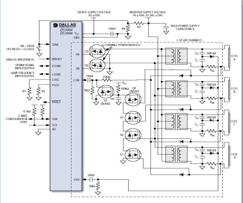 DS3984/DS3988采用推挽驅(qū)動架構(gòu),可以使用更低成本、更高效率的n通道MOSFET。轉(zhuǎn)換器直流電源電壓也可采用更高的電壓。單獨的燈控制和監(jiān)測可提供均勻的亮度,并減少轉(zhuǎn)換器的元件總數(shù)。采用單獨的燈控制時,如果某一個燈失效,僅會使這個失效的燈停止工作,其他燈繼續(xù)工作,并不會受影響。片上振蕩器產(chǎn)生的燈頻和脈沖調(diào)光頻率被嚴格限定在±5%水準,消除了對於顯示影像的影響,并且也可被同步至外部時脈源。