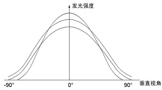 每個燈點在不同的角度觀看時亮度是不同的,且每個燈點隨著角度變化的光強分布曲線也不同。下圖為三顆LED燈點的發(fā)光強度隨垂直視角變化的示意圖線: