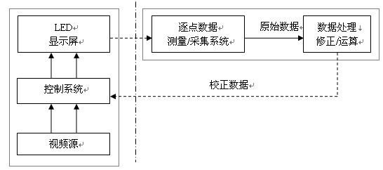 (圖一 注:圖中點劃線左側(cè)是顯示屏系統(tǒng),右側(cè)是逐點校正數(shù)據(jù)采集與運算系統(tǒng)。)