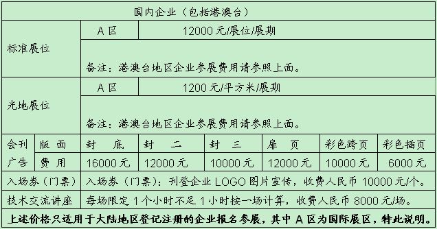 1、標(biāo)準(zhǔn)展位(3m×3m﹦9M2,配置:公司中英文楣牌、展出場(chǎng)地、展位地毯、三面2.5M高圍板、一張洽談桌、二把椅子、一個(gè)220V電源插座、兩支射燈。)