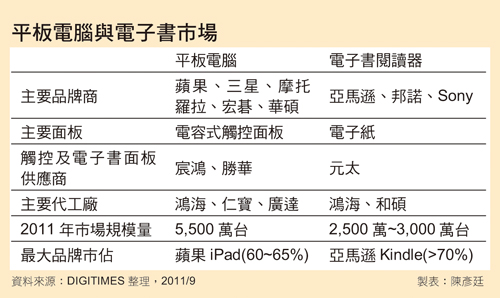 蘋果iPad系列持續(xù)在平板計算機市場一枝獨秀,爆發(fā)性成長讓各家電信、PC及手機制造廠趨之若鶩,由于平板計算機具備多媒體觸控特性,讓電子書閱讀器業(yè)者憂心忡忡,擔心平板計算機大軍崛起恐沖擊電子書市場,然蘋果憑借軟件、成本、價格與規(guī)模優(yōu)勢,陸續(xù)讓部分平板計算機業(yè)者知難而退,反觀電子書市場穩(wěn)定成長,供應鏈廠商業(yè)績持續(xù)翻揚,平板計算機大軍暫難發(fā)揮影響力,讓電子書廠商暫時松了一口氣。就目前平板計算機品牌版圖來看,仍以蘋果iPad系列獨占鰲頭,業(yè)界預估2011年市占率約60~65%,其次是三星電子(Samsung Electronics),市占率約5~6%,其它各品牌廠市占分別落在1~3%,尤其是2011年初時被業(yè)界視為蘋果iPad殺手,未推出產品就先轟動的惠普(HP)、RIM及摩托羅拉(Motorola)等品牌廠,推出前預估出貨量很高,然這些憑借品牌及軟件平臺光芒的先頭部隊卻最先敗陣,讓現(xiàn)存平板計算機業(yè)者更加憂心。