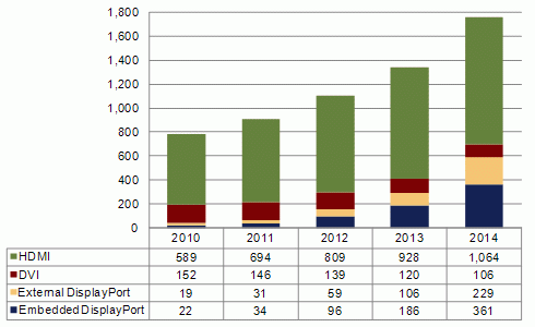 另外在PC/Display Interface By Device, Q4’11 Forecast (電腦與顯示器接口統(tǒng)計數(shù)據(jù)庫與預(yù)測) 報告中,In-Stat 針對所有搭載各種接口(Embedded DisplayPort, External DisplayPort, DVI, HDMI)的數(shù)字電子裝置進(jìn)行統(tǒng)計與預(yù)測。2011年在所有搭載數(shù)字界面的電子裝置中,搭載HDMI的數(shù)量達(dá)到了9億零6百萬單位,預(yù)計2014年將成長到17億單位以上。這其中包含了智能手機(jī)、移動電腦、投影機(jī)、電腦顯示器、周邊裝置、數(shù)碼相機(jī)、攝像機(jī)、MP3、游戲機(jī)、機(jī)頂盒、藍(lán)光播放器、數(shù)字電視、商用顯示器等手持式消費(fèi)性電子產(chǎn)品和固定式消費(fèi)性電子產(chǎn)品。