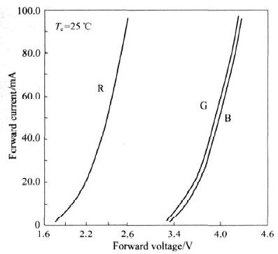 圖1 和圖2 反映了一組R、G、B 3 種LED 的正向電壓VF與正向電流IF 以及IF 與亮度L 間的關(guān)系。可以看出,超過(guò)門限電壓后,隨著VF 的增加, IF 先是緩慢增加而后便急劇增加。