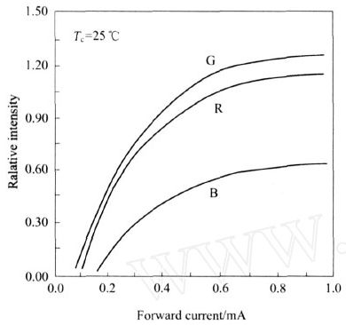 從圖2 的IF 與L 曲線可知, IF 的大小直接影響了L 。當(dāng)IF 達(dá)到一定值以后,L 基本趨于飽和。根據(jù)圖1 和圖2 的VF 、IF 和L 特性,在實(shí)際中通常用VF 的方式驅(qū)動(dòng)LED ,用串連電阻值的大小調(diào)整LED 的RGB 三基色的IF 使其L 一致。而系統(tǒng)對(duì)RGB 三基色的IF 的調(diào)整,是以常溫為基本的標(biāo)準(zhǔn)。