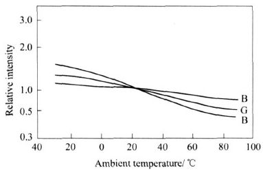 但從LED 的亮度特性圖3 可知,隨著環(huán)境溫度TC 的變化,L ED 的RGB 三基色的顯示亮度偏移狀況各不相同,B 的飄移較小,而R 的飄移較大,當(dāng)溫度超過(guò)80 ℃時(shí),R 相對(duì)亮度的變化幾乎是常溫時(shí)的2 倍。這種變化完全破壞了常溫時(shí)設(shè)置的白平衡,使整個(gè)顯示屏的色度發(fā)生嚴(yán)重漂移,圖像質(zhì)量變差。RGB 三基色的相對(duì)亮度的偏移如圖4 示,可明顯看出,常溫時(shí)三基色的亮度狀態(tài)和在85 ℃及- 20 ℃時(shí)的相對(duì)亮度值,正是L ED 的溫度特性導(dǎo)致冬季和夏季顯示屏的圖像質(zhì)量變差。