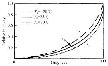通過(guò)對(duì)RGB 三基色發(fā)光二極管(LED)溫度特性的測(cè)試和分析發(fā)現(xiàn),隨著環(huán)境溫度的變化,每種基色的LED 亮度與常溫時(shí)的亮度相比都會(huì)發(fā)生一定程度的偏移,且其偏移量不相同,導(dǎo)致了圖像白場(chǎng)平衡的失真。為了校正失真,針對(duì)每個(gè)基色LED 提出一種不同環(huán)境溫度下的Gamma 補(bǔ)償曲線,使RGB 三基色LED 在環(huán)境溫度變化時(shí)具有相同的亮度偏移值,以保證白場(chǎng)平衡。本文提出的Gamma 補(bǔ)償技術(shù)克服了L ED 的溫度特性引起顯示屏圖像的色彩失真和白場(chǎng)平衡的破壞,使圖像的色彩不會(huì)受環(huán)境溫度的變化而失真。